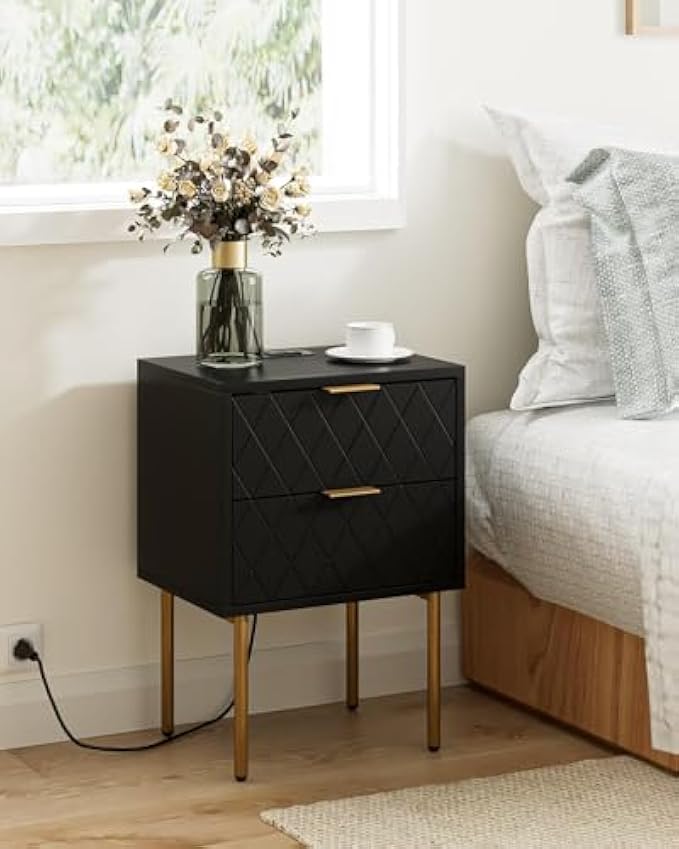 Nightstand,Small Bedside Table with Gold Frame,White Night Stand,Bedside Furniture,Side Table with Drawer and Shelf for Bedroom,Living Room (Morden-Stripe-2Drawer, Black-Outlet)