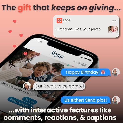 VOTED “BEST FOR EASE OF USE”: Getting started with your Loop digital photo frame is effortless—connect to Wi-Fi, create a free account on the Loop app, and send photos and videos in seconds. Your picture frame digital slideshow will even play loaded photos without wifi connection. ONLY DIGITAL FRAME YOU CAN TEXT MESSAGE PHOTO TO: Of course Loop has an intuitive iOS and Android App, BUT what is easier than just text messaging a photo? You can have it both ways with Loop simple to use digital picture frames load from phone! ULTRA-CRISP HD QUALITY SCREEN: Showcase your memories in the electronic picture frame slideshow as clear as the day they were made. Loop’s wifi digital picture frame boasts a contemporary design, an easy-to-use 10.1” touchscreen, and a 1280x800 HD-quality display. THOUGHTFUL FEATURES DESIGNED WITH YOU IN MIND: Enjoy little touches like digital photo album organization, captions, and comments. Scheduled sleep mode means your Loop saves power while you snooze. A PERFECT GIFT FOR NON-TECH SAVVY FAMILY: The Loop wifi picture frame is one of the top choices for digital frames for photos as a gift for newlyweds, a gift for new parents, a gift for mom with new grandbabies - everyone needs a digital frame for home!