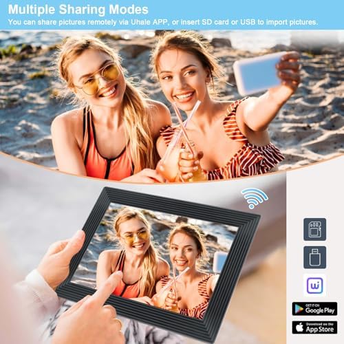 【IPS HD Touch Screen】This 10.1-inch digital photo frame is equipped with a FHD touch LCD screen. You can enjoy High-Definition pictures and videos from all angles. Uhale electronic photo frame supports JPG/ JPEG/ BMP/ PNG image format and MP4 video format. 【Large Storage&Multiple Upload Methods】This digital frame offers you a huge storage capacity with built-in 16GB memory (around 30,000 photos of 300KB/pc). It also supports the micro SD card and USB drive connectivity to enable you to read the files and export, and back up the received photos and videos for better album management. Supports a max 64GB micro SD card (Not Included). 【WiFi Digital Photo Frame】Connect the digital frame to home WiFi, and then download the free Uhale App on your phone (download from Android or iOS), easily send photos or a video(use app max 15 seconds, or use a micro SD card to upload unlimited video duration) to the frame. And also your families and friends can privately and safely share wonderful moments with you from anywhere and anytime. 【Multifunctional Custom Settings】Smart picture frame Come with a detachable holder as a frame stand. Multifunctional custom settings, such as play order, image zooming, hide/publish images, display caption, adjustable brightness, sleep mode, etc. The User-friendly interface design makes it easy to use for all ages. 【Perfect Gift】Share your precious and wonderful moments of life on the electronic photo frame from anywhere where you are, let family and loved ones enjoy your wonderful moments and feel that you are just staying together. Yamemo Digital Frame is an ideal present for birthday, wedding, graduation ceremony, family gathering occasions.Meanwhile, it is a good decoration in your bedroom or living room, even in the office, as a perfect tool to advertise products in a bar or store.