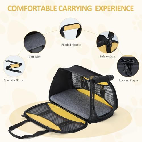 AIRLINE APPROVED CARRIER: Pet carrier for dog cat is TSA approved(Including budget airlines) and can be placed under the seat in the cabin,We recommend that you speak to the airline before you depart CHECK PET SIZE: Please measure your pet's length and height and weight and other 3 data before purchasing to make sure your pet can stand, lie down and sit comfortably in the pet carrier travel bag,Cat carriers size:17.71"Lx10.23"Wx12.59"H,Weight 15lbs or less BETTER BREATHABILITY: The small pet cat carrier has breathable mesh windows on all 4 sides, excellent air circulation to prevent your pet from sweltering, and a wide field of vision for your pet to observe and for you to communicate with your pet STURDY FABRIC: Comparison of similar products made of waterproof, non-toxic, scratch-resistant and wear-resistant new fabrics, mesh material has been upgraded to effectively prevent pets from tearing the mesh with their nails, preventing pets from falling out of the pet carrier for dog cat EASY TO CARRY: Cat dog carriers for pet travel, take your pet to the office, walk in the park, visit the vet, the adjustable shoulder straps and carrier can attach the cat carrier to your luggage ,on any mode of transportation, thus ensuring your pet a safe journey #43,563 in Pet Supplies ( ) #99 in #110 in