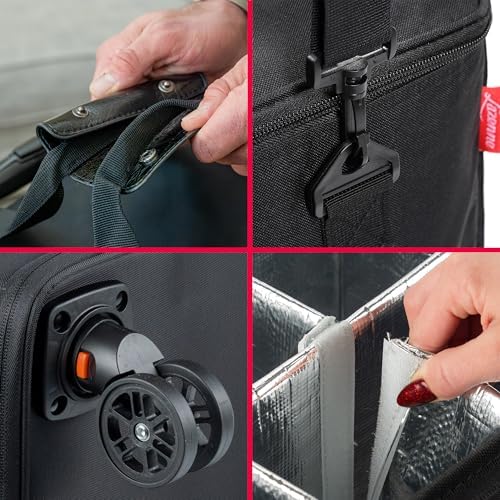 HELPING WINE GET FROM A-TO-B: With its insulated padded sides, 360 degree rolling removable wheels, padded, 12-bottle removable insert and versatile handles, this wine carrier is not JUST a wine professional’s dream come true, but all wine lover, too! It’s also an insulated Cooler Bag for picnics and parties; and tote for camping or at the beach. No matter where wine wants to go, Lazenne helps it get there – safe and cold. TRANSPORT 50 LBS, NO HASSLE: This travel bag lets you safely AND conveniently take 12 bottles of wine, beer, champagne, and spirits anywhere you like. It has a versatile strap you can wear over your shoulder, two comfy handles you can connect like a wine tote, and a 41 inch telescoping handle with smooth 360Deg Castors, so you can effortlessly glide 50lbs of wine across hard floors and pavement. LOTS OF EXTRA STORAGE! While other wine bags for travel hold wine, Lazenne also holds everything else. It has 4 pockets for leaflets, corkscrews and coasters, and a large 16 x 11 space for iPads and small laptops – This pocket is REMOVABLE – So wine professionals can zip it off and easily print logos. The storage is also durable, because it’s made from 1680D Balistic Nylon and reinforced stitching. FITS TWELVE ANY-SIZE BOTTLES: Empty, your 12x bottle carrier is 16 x 14 x 19 inches. It takes the tallest Rieslings (… even opened), and the thickest champagne bottles. And of course, ice cold wine gifts like Prosecco. The 3-Sided Zip Top make it easy to get bottles in and out. And the insulated, removable inserts let you transform your wine suitcase into an insulated wine cooler bag or picnic bag. “NO BREAK” PROMISE: We’ve flown more than a million bottles around the world safely with our UK only, “Flying with Wine” Range. And even though you can’t check THIS trolley onto airplanes, you CAN expect it to be of the same high quality as all our bags. If not, we’ll replace your bag with our Lifetime Warranty. Carry your wine from A to B safely with Lazenne Wine Luggage.